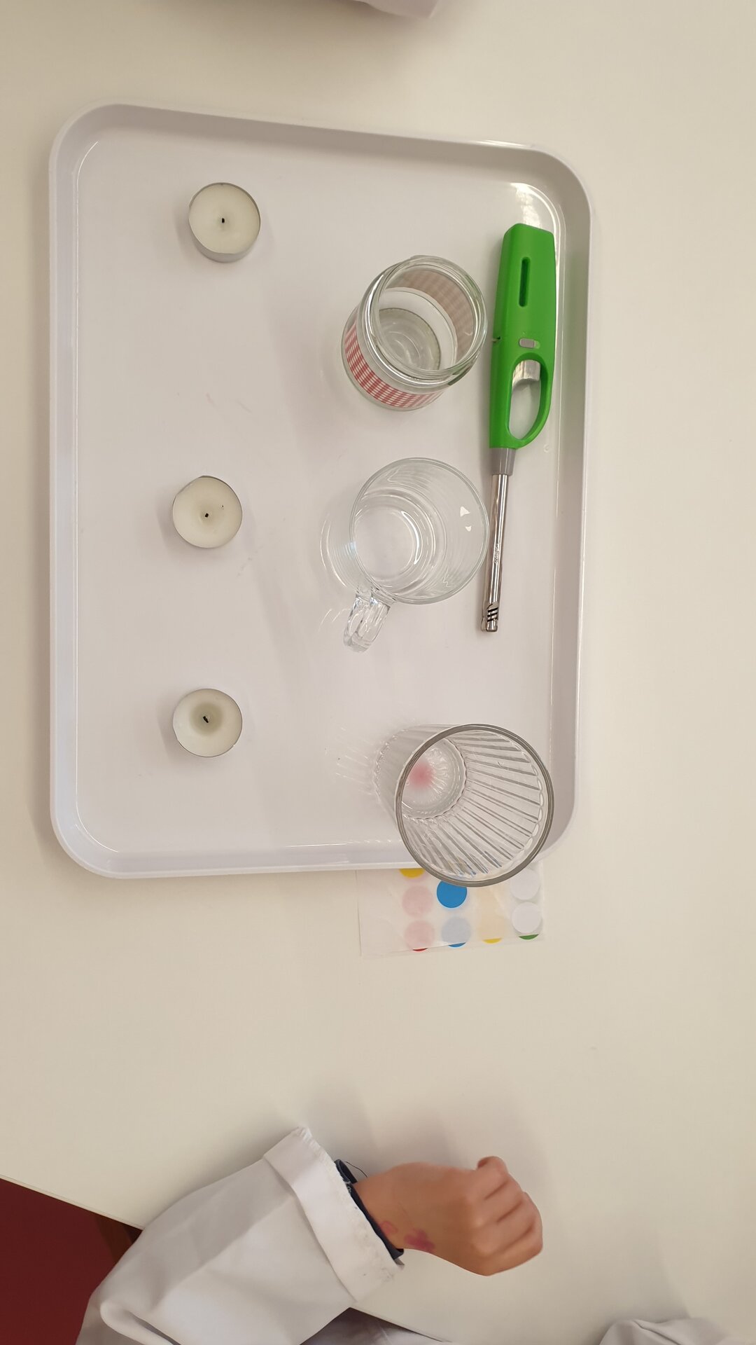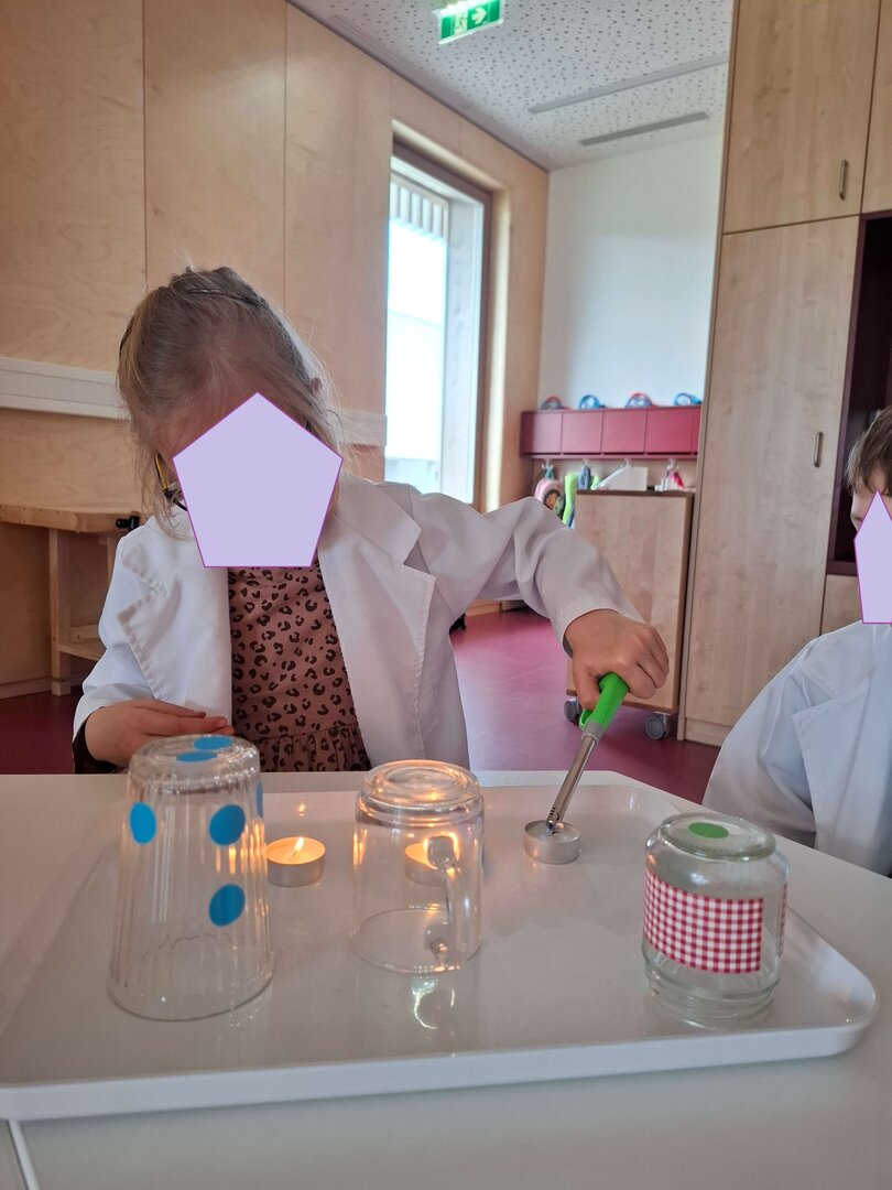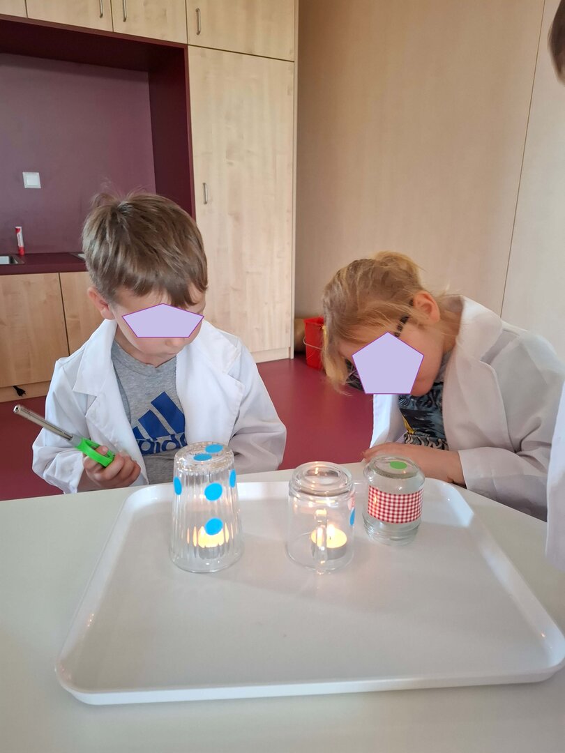 Doch was ist Luft? Um Luft und Sauerstoff darzustellen, ließ uns das erste Experiment schon staunen. Gemeinsam zündeten wir das Teelicht an und schauten was passiert, wenn wir ein Glas darüber stellen. Manche von uns wussten bereits, dass die die Kerzenflamme ausgehen wird.
