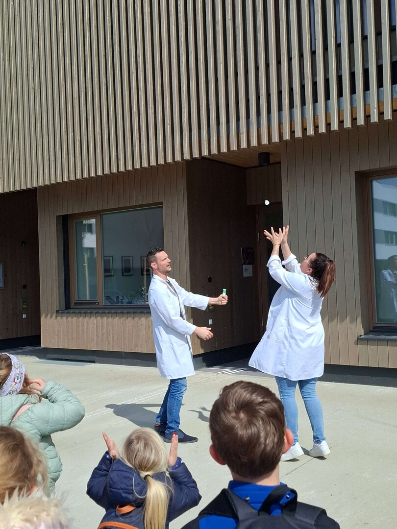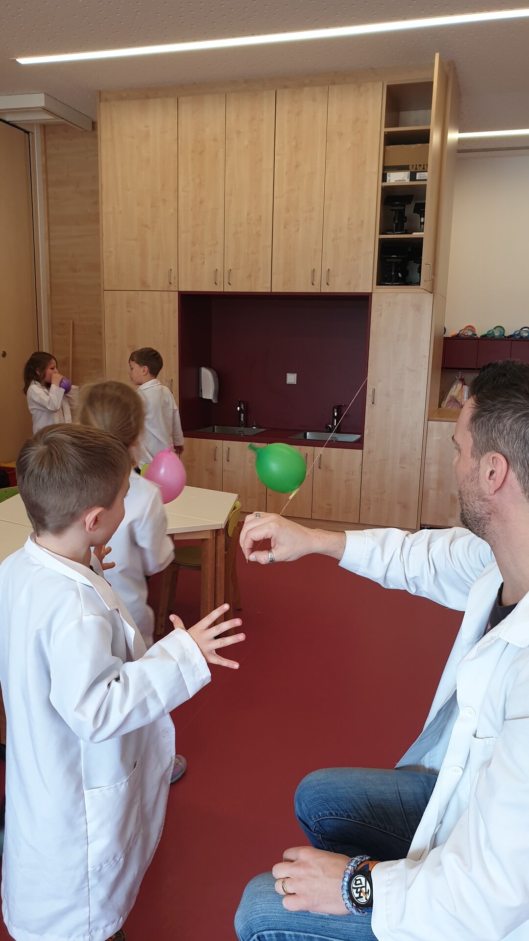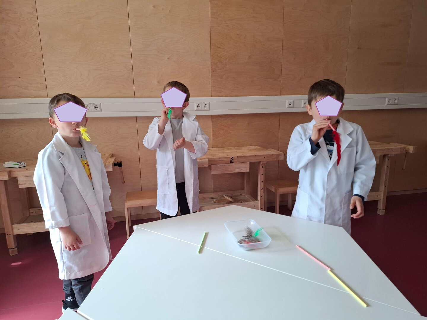 Unsere Schulkinder machten sich wieder auf den Weg in das MINI EDULAB Center in Villach. Die Forscherpuppen begrüßten uns und schon machten wir uns bereit zum Forschen. Mit den Forschermänteln macht das natürlich gleich viel mehr Spaß. Diesmal begleiteten uns Alex, Andy und Lorena durch die Thematik Luft.