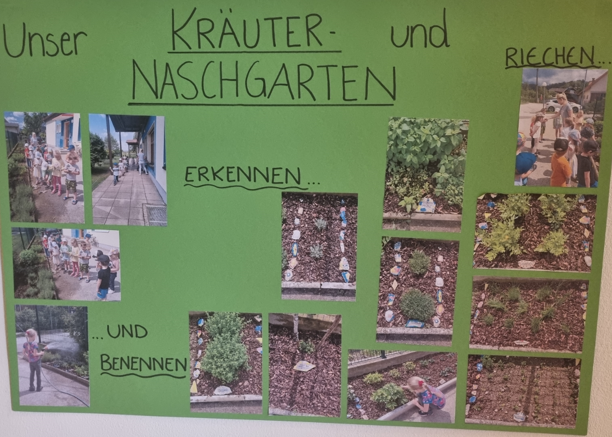 Da für uns nicht nur die gesunde Ernährung von großer Bedeutung ist, sondern auch das Nahebringen von Nutzpflanzen und Kräutern, haben wir vor unserem Kindergarten ein selbst angebautes Kräuterbeet. Die Möglichkeit frische Kräuter zu ernten und diese zu verarbeiten ist eine Bereicherung für unsere vielfältige und ausgewogene Küche. Somit haben wir köstlichen Schnittlauch für leckere Jausenbrote, aromatische Zitronenmelisse für erfrischende Getränke und viele verschiedene Gewürzkräuter zum Verfeinern unserer Speisen.