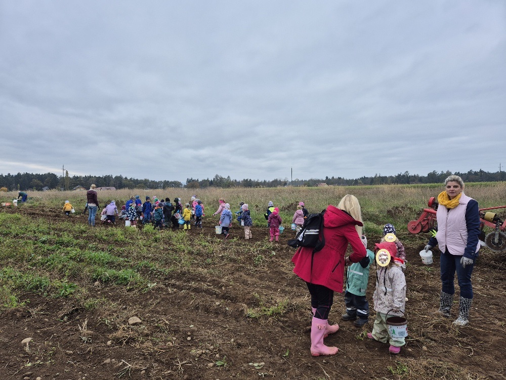 Ausgerüstet mit Kübeln und Arbeitshandschuhen machten wir uns auf den Weg zum Ackerstück. Dort wartete schon unser Kartoffelbauer auf uns. Wir durften ihn bei der Kartoffelernte unterstützen. Die Kartoffelkiste wurde voller und voller. Natürlich wurden auch unsere mitgebrachten Erntekübel nicht leer nach Hause getragen.