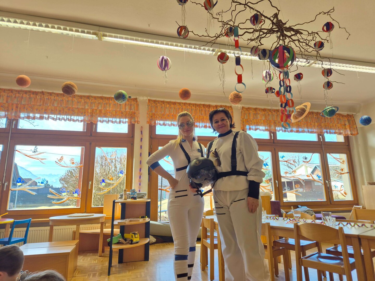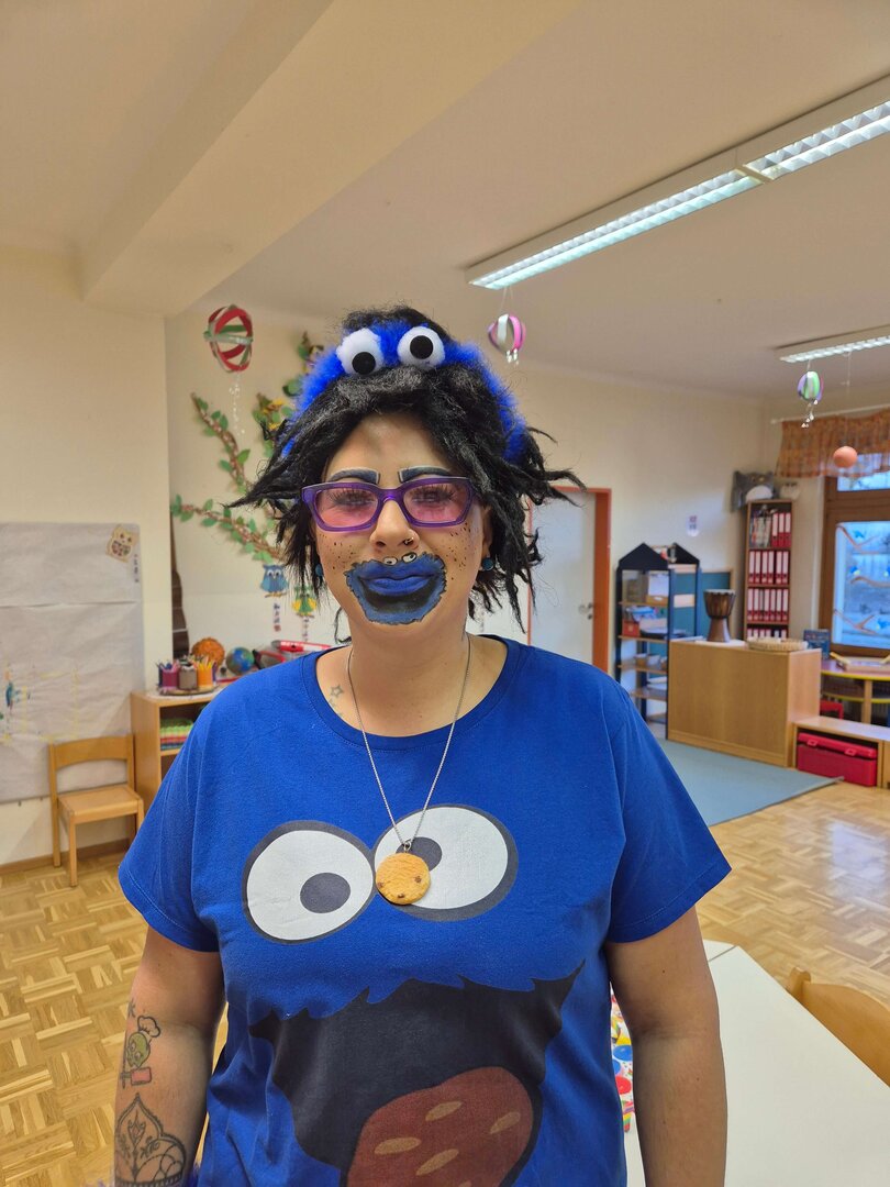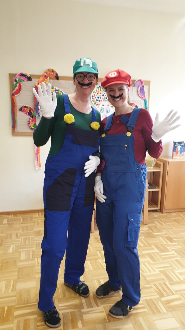 Mit ausgelassener Stimmung empfingen die Kinder, anstatt unserer Betreuerinnen, Super Mario und Luigi, zwischendurch auch Peach, in der Bienengruppe, zwei Astronaut/innen, Peach und eine Mickey Mouse in der Eulengruppe. In der Küche war ein Cookie Monster zu finden.