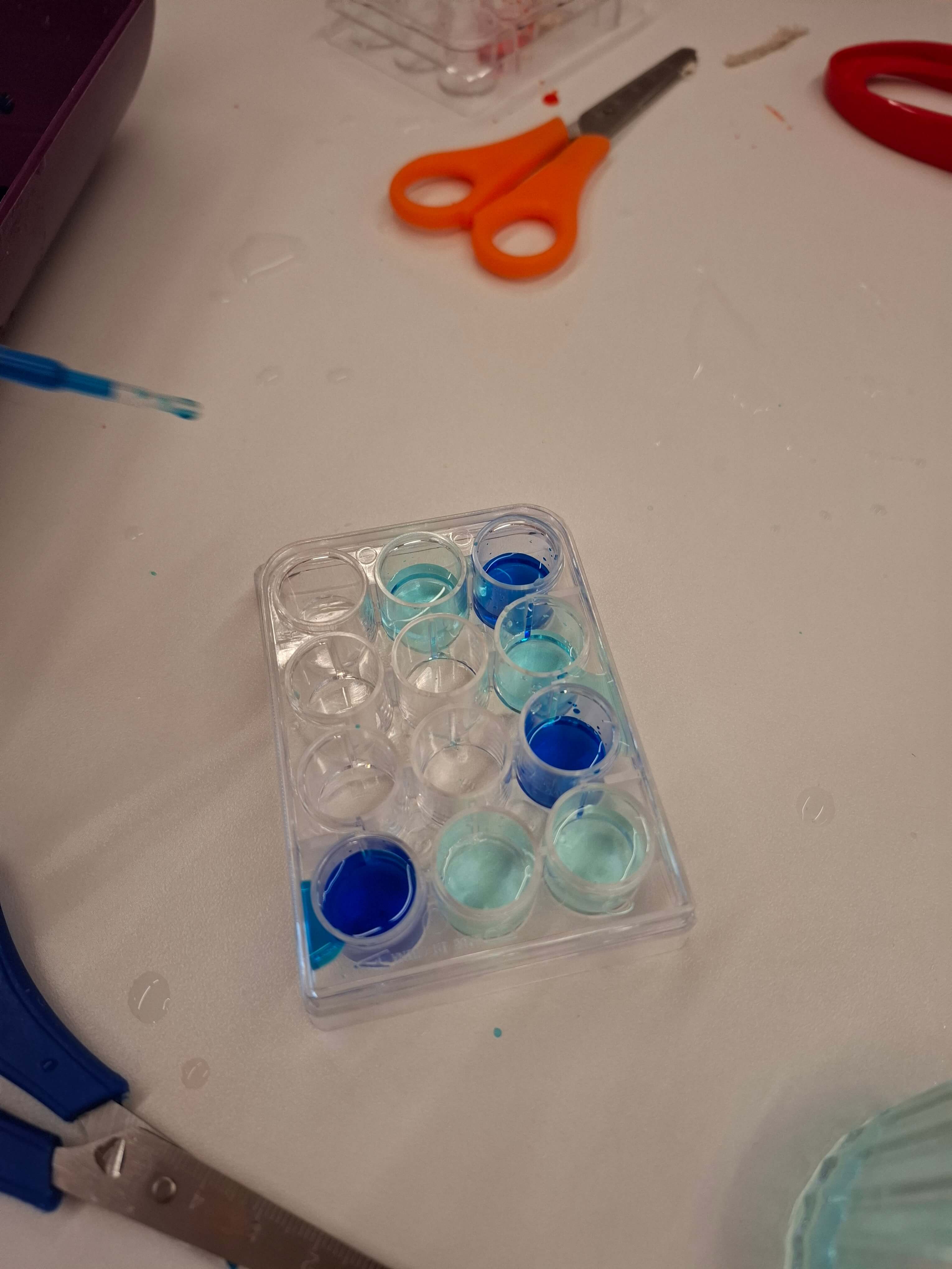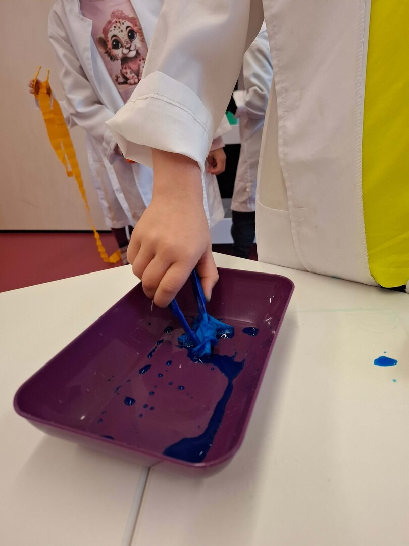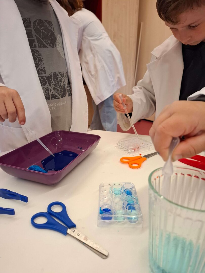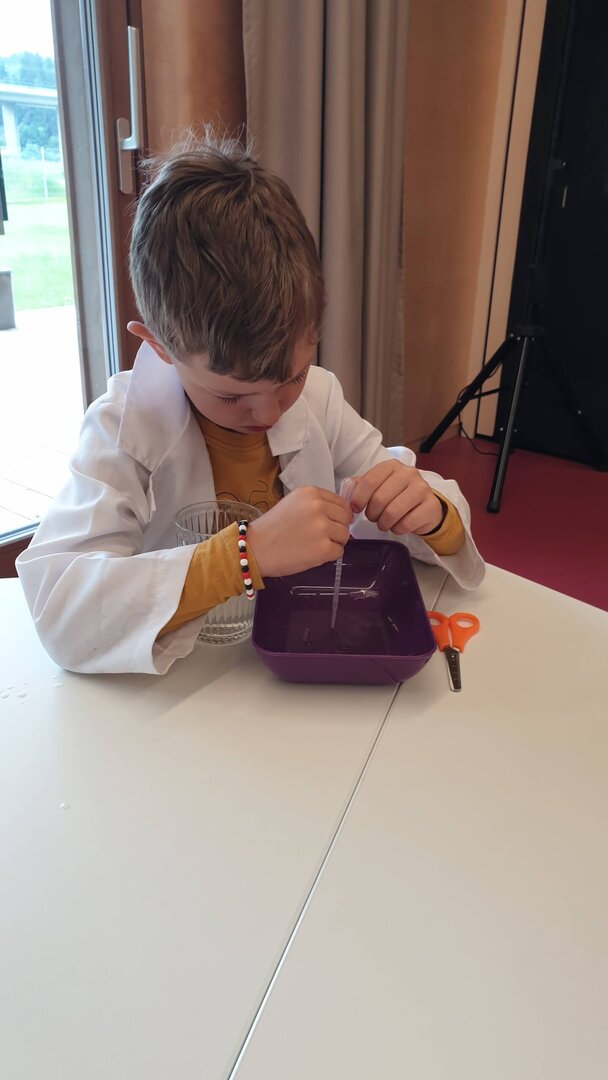 -stärken. Vor allem interessierte uns die Veränderung, wenn Wasser darauf trifft. Auch mit Seidenpapier wurde experimentiert und schon bald entdeckten wir, dass dieses Papier abfärben kann. So entstand das bunte Wasser, welches wir mit Pipetten aufsaugten und in Reagenzgläser abfüllten. Die schönsten Farben durften wir sogar mit nach Hause nehmen, um sie unseren Freuden im Kindergarten zu zeigen.